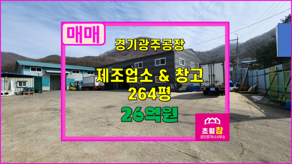 경기광주 초월읍 소재 식품공장 가능 제조업소 + 창고시설 총 264평 매매 물건을 초월 참 부동산에서 소개해 드립니다.