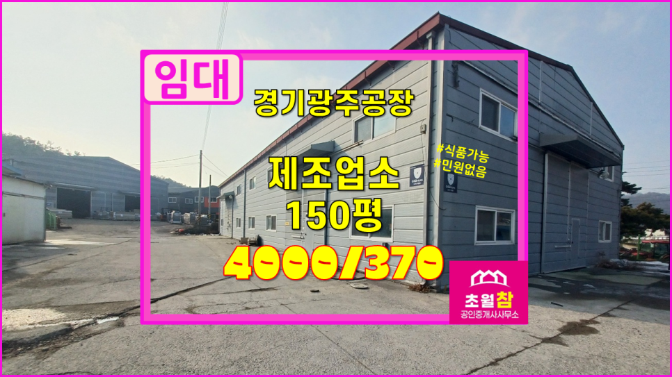 경기광주 초월읍 소재 식품공장가능 민원 없는 위치 150평 제조업소 임대 물건을 초월 참 부동산에서 소개해 드립니다.