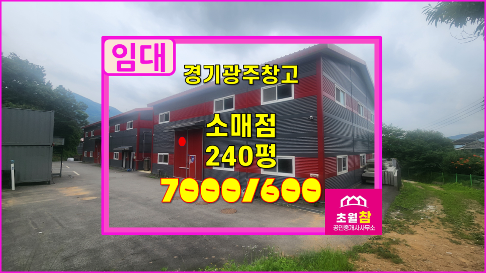 경기광주 초월읍 소재 물류창고 추천 40ft 트레일러 진·출입 가능 2동 구조 총240평 2종근생 소매점 임대 물건을 초월 참 부동산에서 소개해 드립니다.
